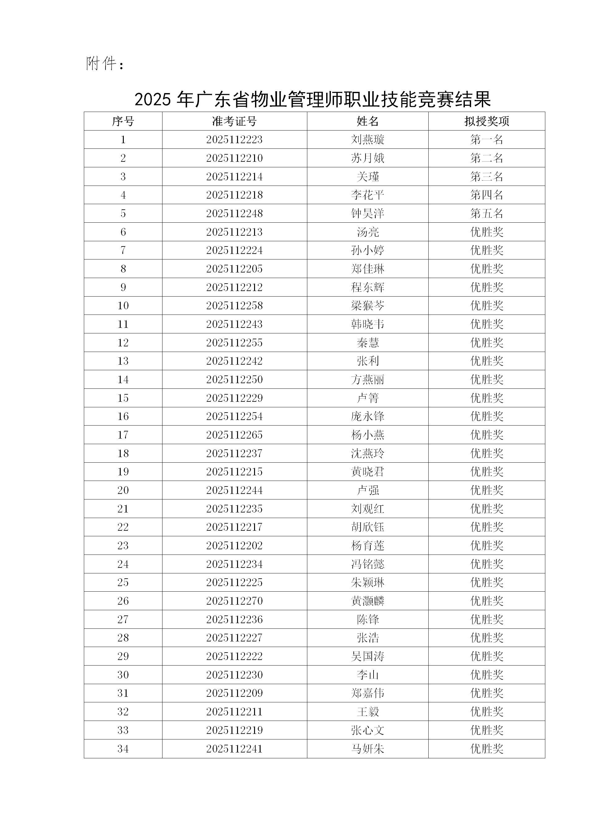 附件:2025年广东省物业管理师职业技能竞赛结果